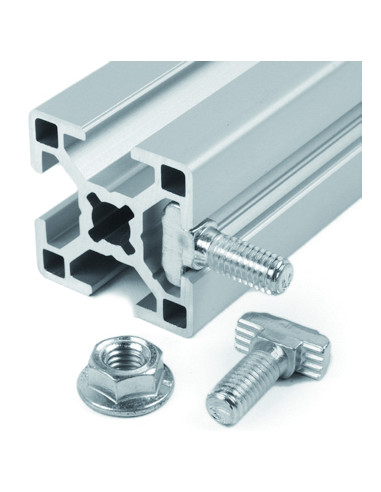 Śruba młoteczkowa M6x16 z nakrętką kołnierzową M6 do rowka 8mm, to element montażowy powszechnie stosowany w systemach profili aluminiowych Leanflex. Jej charakterystyczną cechą jest łeb w kształcie młoteczka, który umożliwia wsunięcie jej bezpośrednio w rowek profilu aluminiowego lub wprowadzenie od góry. W momencie dokręcania, łeb śruby obraca się o 90 stopni i klinuje się w rowku profilu podczas dokręcania, co zapewnia stabilne i pewne mocowanie bez konieczności wiercenia. Nakrętka kołnierzowa, będąca uzupełnieniem śruby, zwiększa powierzchnię docisku i zapobiega luzowaniu się połączenia. Zestaw ten stosowany jest m.in. do montażu wsporników, kątowników i innych elementów konstrukcyjnych.Zestaw może być stosowany m.in. do kątowników Leanflex 40x40, 40x80, 80x80, 45x45, 45x90, 90x90 serii LB